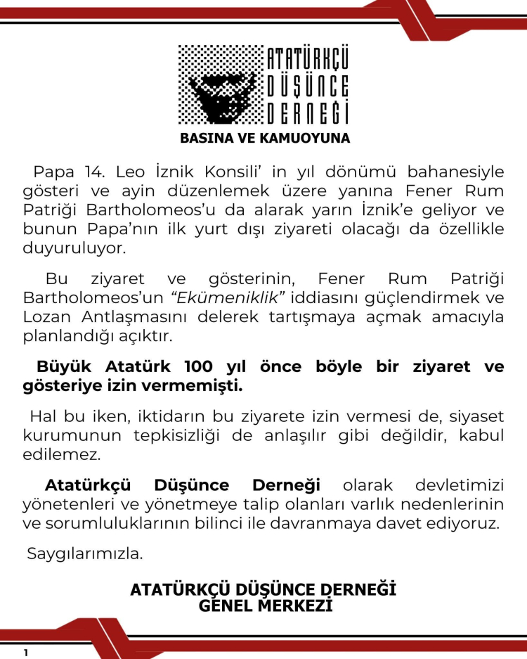 Atatürkçü Düşünce Derneği Genel Merkezi Papa'nın İznik Ziyaretine tepki için yazılı bir basın açıklaması yaptı. Sansürsüz ve yorumsuz şekilde yayınlıyoruz.