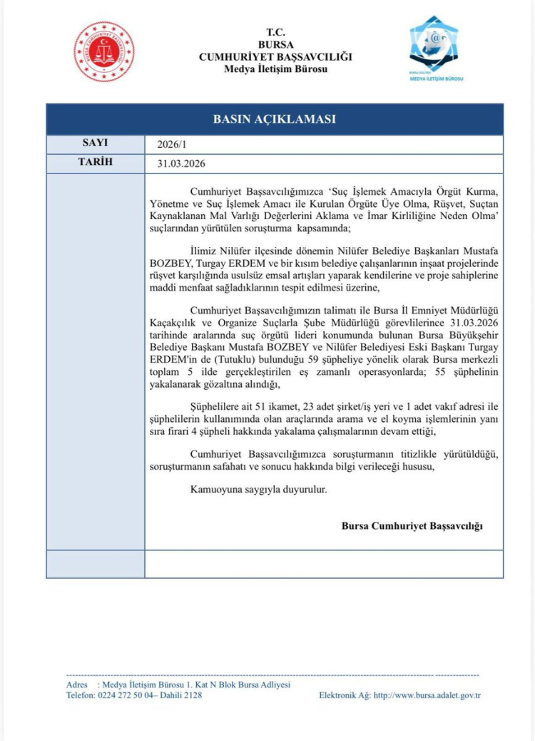 Bursa Cumhuriyet Başsavcılığı Bugün yaşanan operasyon hakkında bir basın açıklaması yayınladı.