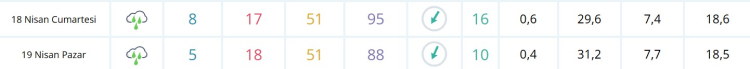 19 Nisan Pazar günü de yağışlı hava etkisini sürdürmeye devam edecek. Gündüz sıcaklığı 18 derece ile bir önceki güne göre 1 derecelik artış gösterse de, gece sıcaklığı 5 dereceye kadar gerileyecek. Pazar günü nem oranı %88 civarında ölçülürken, açık havada etkinlik planlayanların yağış ihtimalini göz önünde bulundurması tavsiye ediliyor.