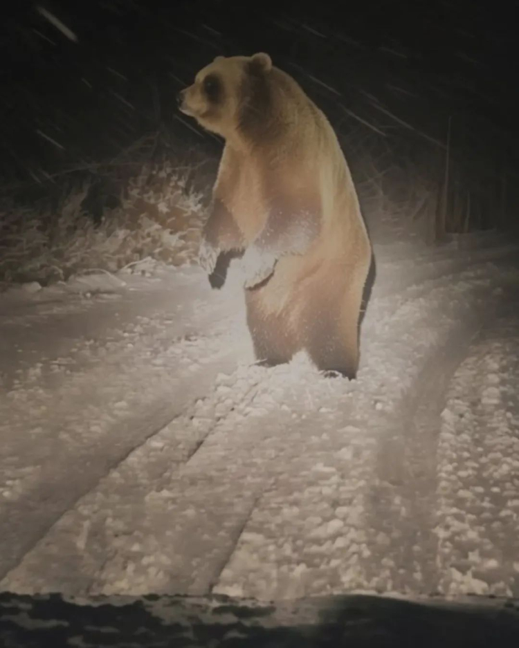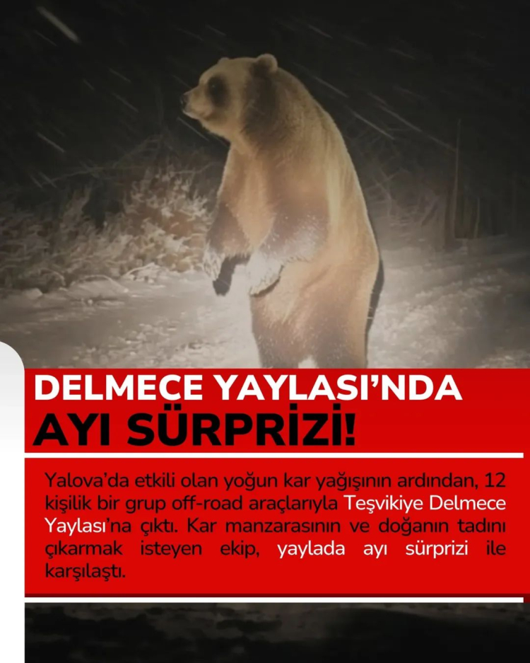 Beyaza bürünen Delmece Yaylası’nda ilerleyen araçların önüne, bir anda bir ayının çıkması herkesi şaşkına çevirdi. Keyifli başlayan “kar keyfi”, saniyeler içinde adrenalin dolu anlara dönüştü.
