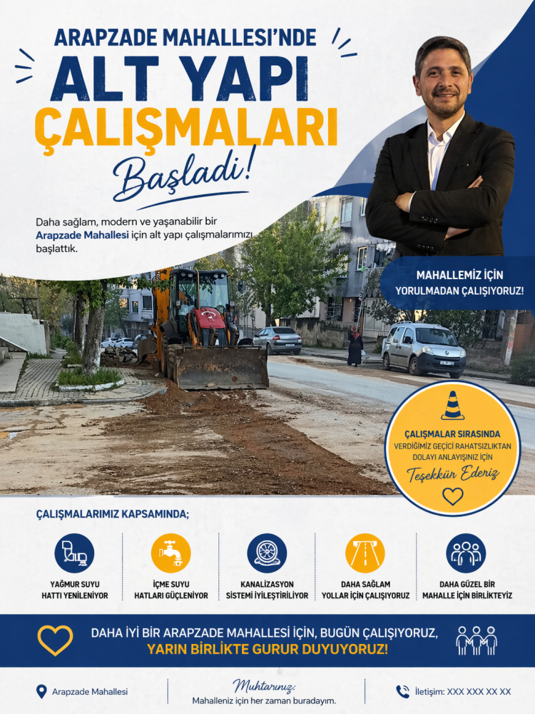 Bursa ili Orhangazi İlçesi Arapzade Mahallesinde Alt yapı çalışmaları başladı. Mahalle Muhtarı Caner Yalçın Mahalleliden biraz sabırlı olmalarını istedi.