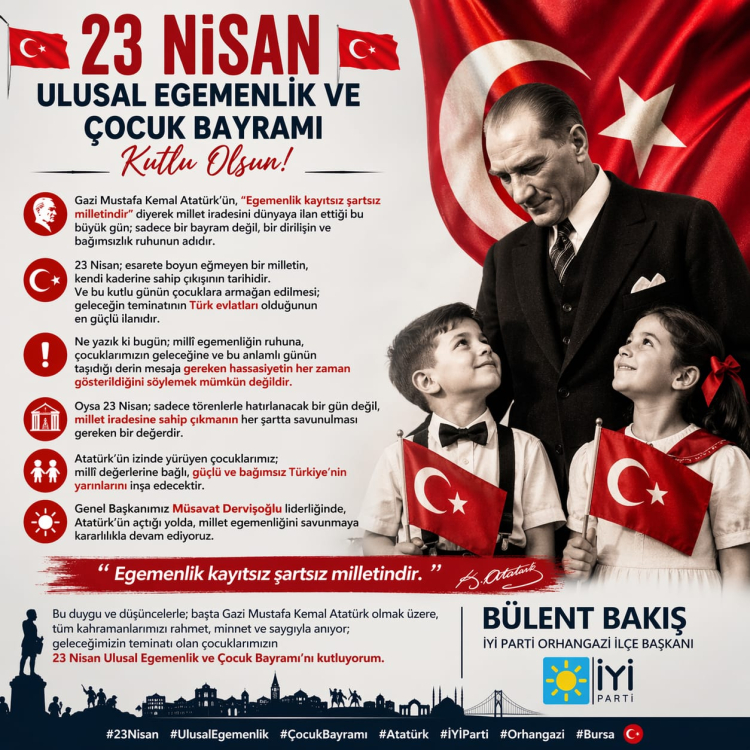 23 NİSAN ULUSAL EGEMENLİK VE ÇOCUK BAYRAMI KUTLU OLSUN Gazi Mustafa Kemal Atatürk’ün, “Egemenlik kayıtsız şartsız milletindir” diyerek millet iradesini dünyaya ilan ettiği bu büyük gün; sadece bir bayram değil, bir dirilişin ve bağımsızlık ruhunun adıdır. 23 Nisan; esarete boyun eğmeyen bir milletin, kendi kaderine sahip çıkışının tarihidir.