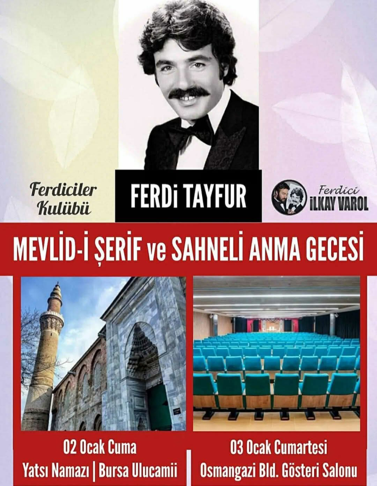 Merhum sanatçımız Ferdi Tayfur'un vefat yıldönümü dolayısıyla Bursa'da tertip ettiğimiz 02 Ocak Cuma Günü 19.00 itibariyle yatsı namazı sonrası Ulucamii "Mevlid-i Şerif" programı ve 03 Ocak Cumartesi günü 20.00 itibariyle Ferdici İlkay Varol sunumlarıyla "Sahneli Anma Gecesi" programına tüm sevenleri davetlidir.
