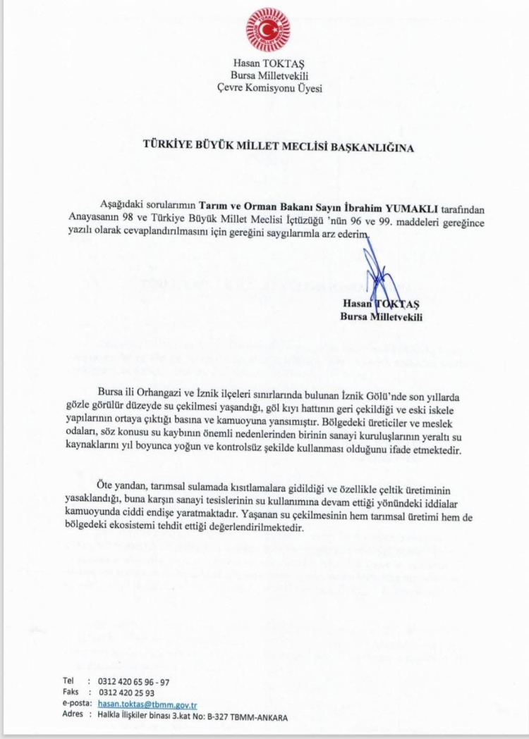 İYİ Partı Bursa Milletvekili Hasan Toktaş, Türkiye Büyük Millet Meclisi’ne sunduğu soru önergesiyle,