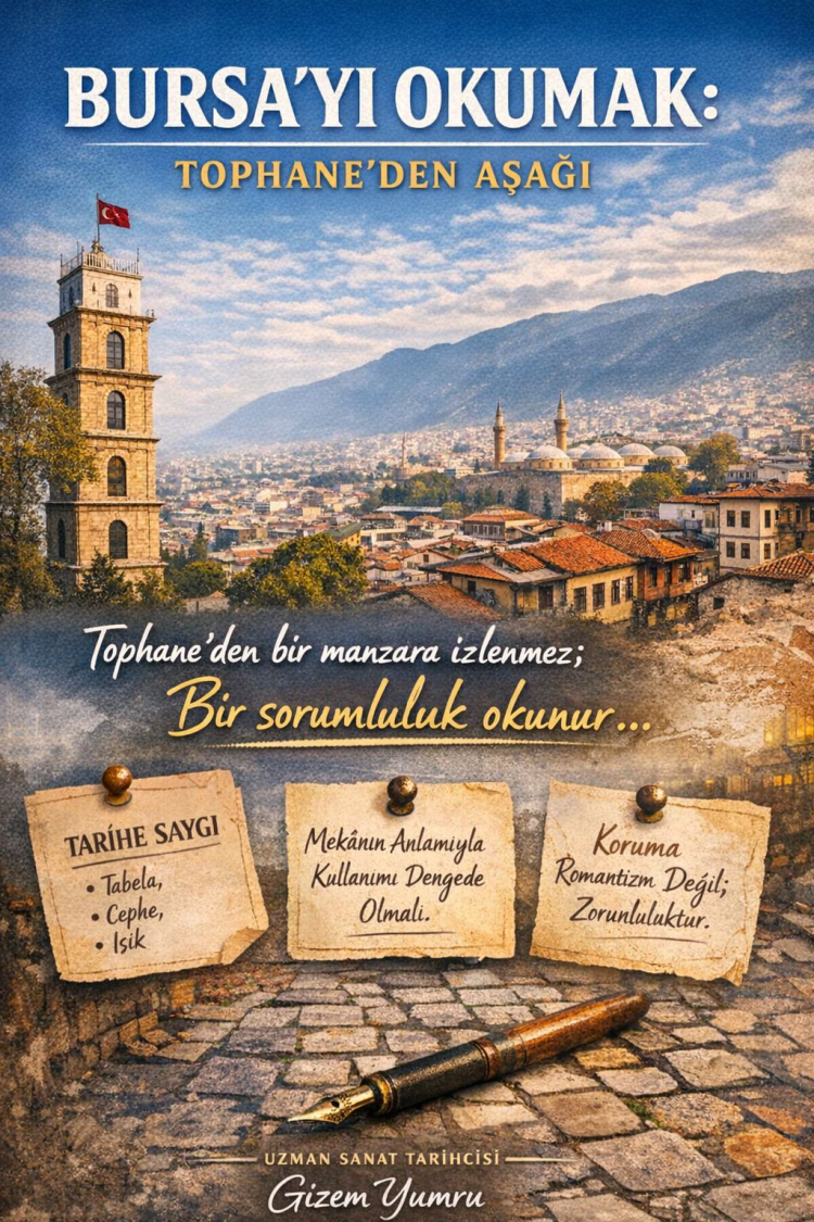 Tophane’den inerken insanın elinde bir manzara kalmaz; bir sorumluluk kalır. Bursa’nın taşına, yazısına, ışığına, sesine… Kısacası Bursa’nın diline dikkat etmek gerekir. Çünkü bu şehir, dikkat edilmediğinde yalnızca yıpranmaz; yavaş yavaş unutulur.