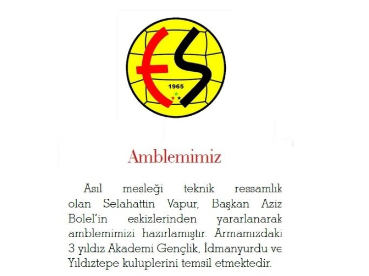 Eskişehirspor kurulduğu yıl olan 1965-1966 sezonunda 2. Lig şampiyonu olmuştur. 1966-1967 sezonunda 1. Türkiye Ligi’ne çıkan takımım 17 takımlık ligde 8’inci olmuştur. Eskişehirspor’un ilk başkanı Aziz Bolel Beyefendi takımın amblemini kara kalem eskizler halinde çizmiştir. Daha sonra profesyonel bir ressam tarafından düzeltilen çizimler, günümüzde de kullanılmaktadır. Amblemde üç, renkli yıldız yer almaktadır. Bu yıldızlar Eskişehirspor’un üç takımın birleşmesinden doğduğunu sembolize eder. Bu takımlar şunlardır. Akademi Gençlik. İdmanyurdu ve Yıldıztepe kulüpleri.